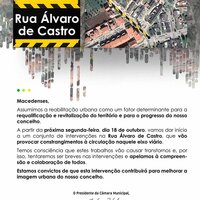 A partir da próxima segunda-feira, dia 18, vamos dar início a um conjunto de intervenções na Rua Álvaro de Castro, que vão provocar constrangimentos à circulação naquele eixo viário.