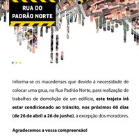 Como tal, o condicionamento de trânsito, na Rua Padrão Norte estará em vigor entre os dias 26 de abril e 26 de junho (60 dias), devido à necessidade de demolição de um edifício, com exceção dos moradores.