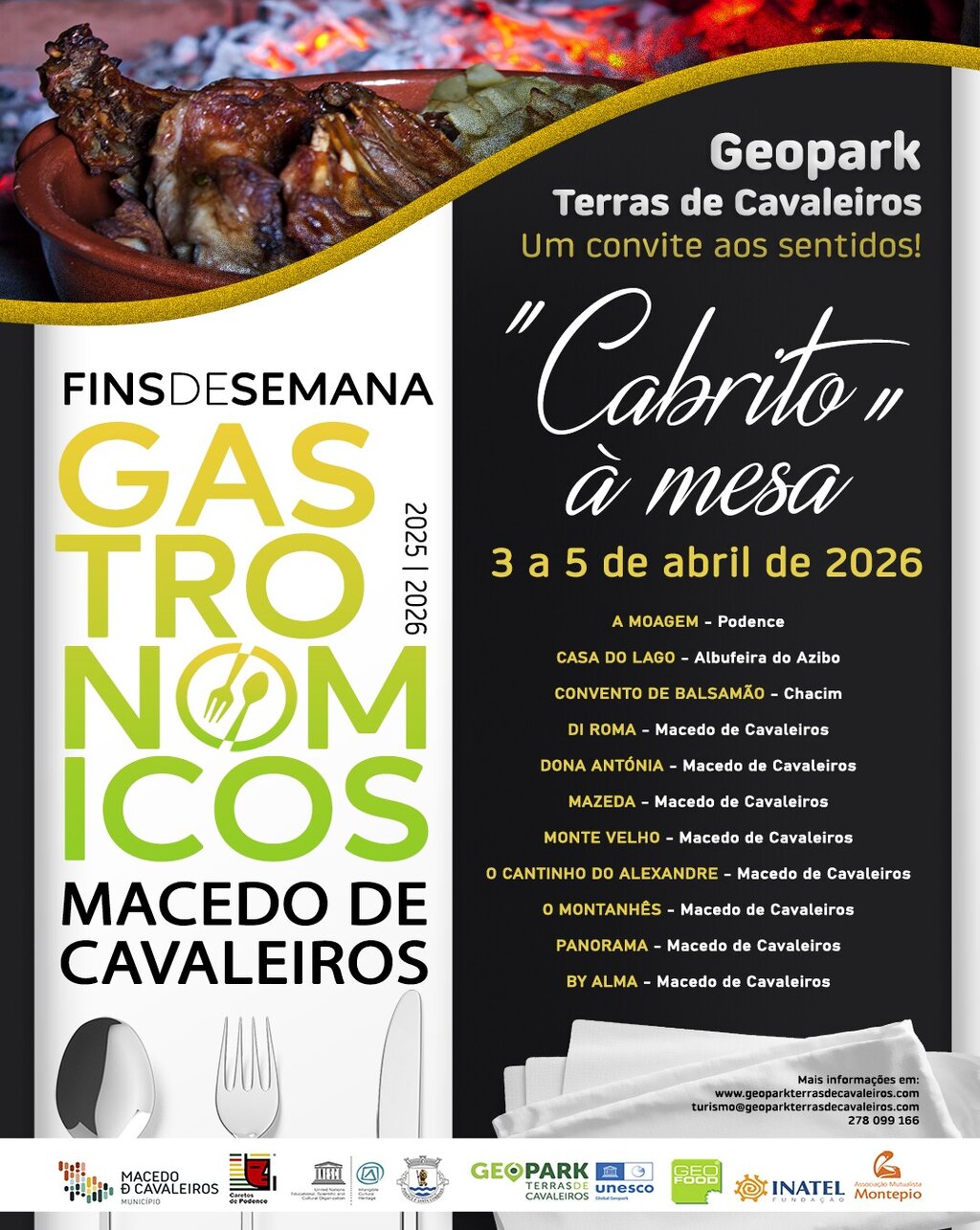 De 3 a 5 de abril, celebre a Páscoa no nosso concelho e venha desfrutar do último fim de semana gastronómico, onde o cabrito será o grande protagonista nos restaurantes aderentes. Um dos pratos mais emblemáticos da nossa região, preparado segundo receitas tradicionais, promete uma experiência gastronómica autêntica, rica em sabor e tradição.