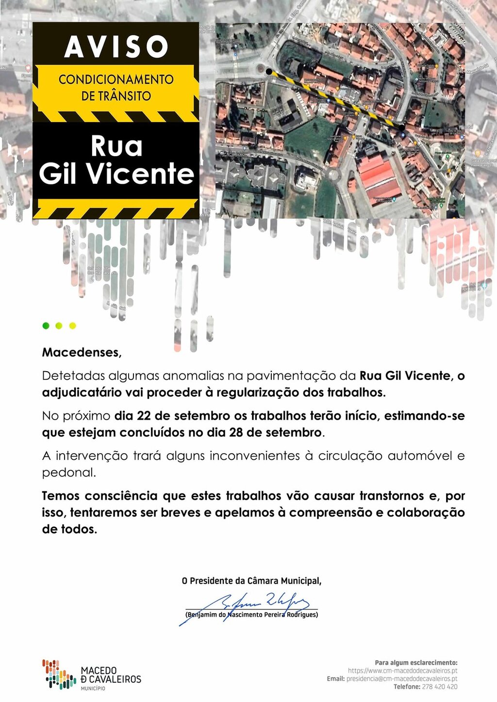 A intervenção trará alguns inconvenientes à circulação automóvel e pedonal, pelo que tentaremos ser breves, apelamos à compreensão e colaboração de todos.