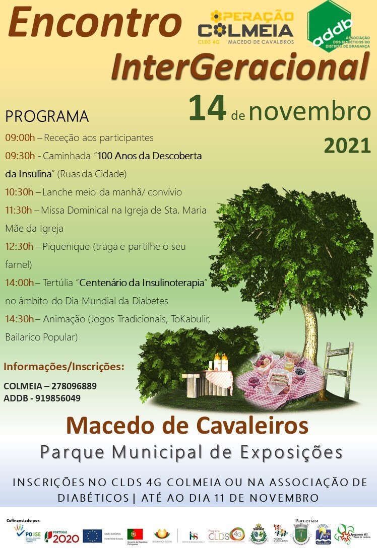 No próximo dia 14 de novembro, no Parque Municipal de Exposições, no âmbito da comemoração do Dia Mundial da Diabetes, irá decorrer o Encontro InterGeracional, organizado pelo CLDS 4G Macedo de Cavaleiros, em parceria com a ADDB - Associação dos Diabéticos do Distrito de Bragança e com o apoio do Município de Macedo de Cavaleiros.