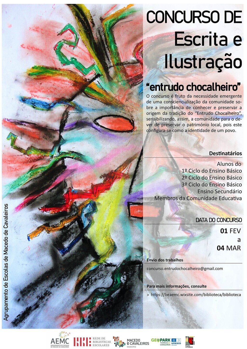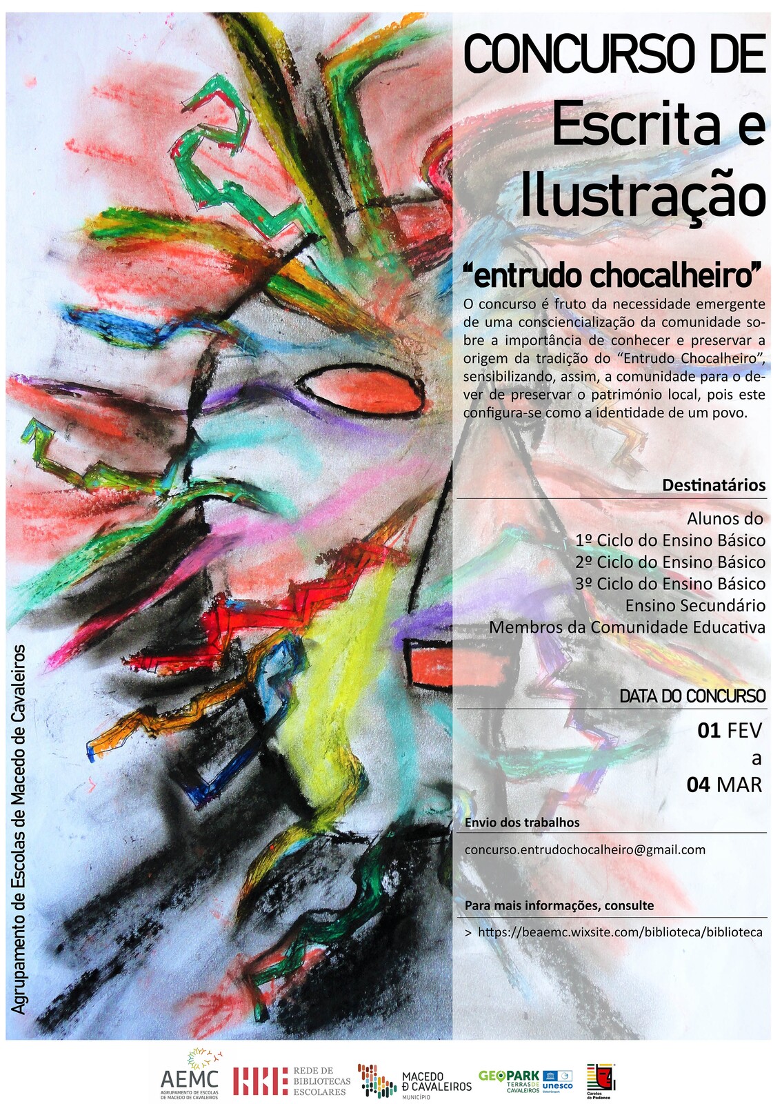 Este concurso de Escrita e Ilustração irá decorrer entre o dia 1 de fevereiro e o dia 4 de março de 2022 e pretende consciencializar a comunidade escolar para a importância da preservação e do conhecimento da tradição do “Entrudo Chocalheiro”, já que este faz parte da identidade do nosso povo.