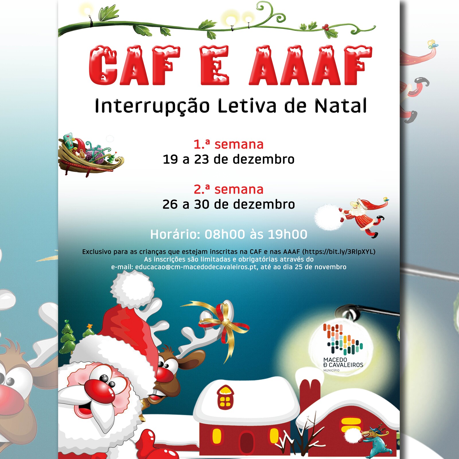 Quem se encontra inscrito na CAF ou nas AAAF deve informar se as pretende frequentar na interrupção letiva do Natal, se deseja almoço e o horário, para o email educacao@cm-macedodecavaleiros, até ao dia 25 de novembro.