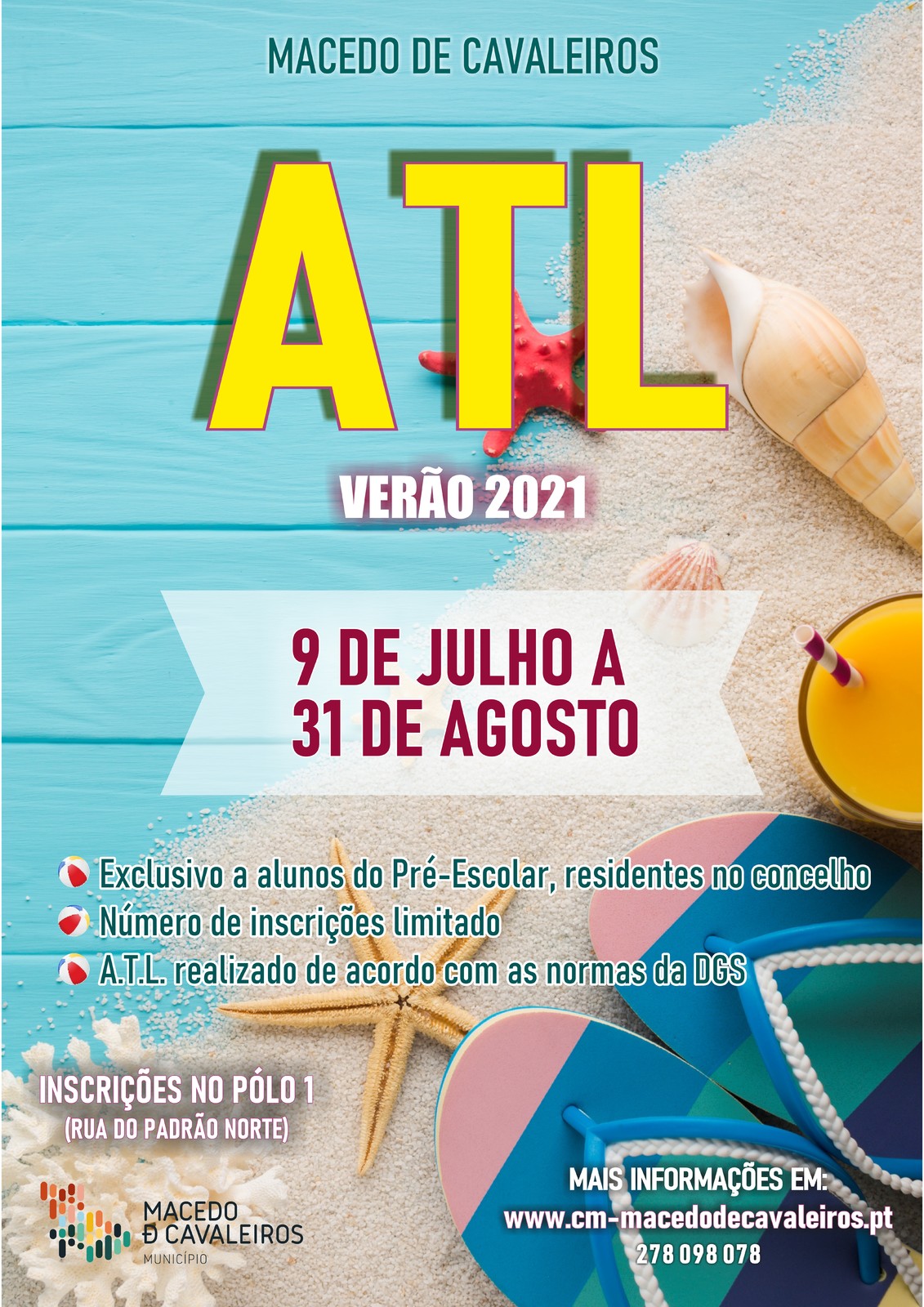 O Município de Macedo de Cavaleiros promove de 09 de julho a 31 de agosto o programa de “ATL – Verão 2021”, que visa proporcionar períodos de ocupação às crianças do Ensino Pré-Escolar residentes no concelho, após o término das atividades letivas.