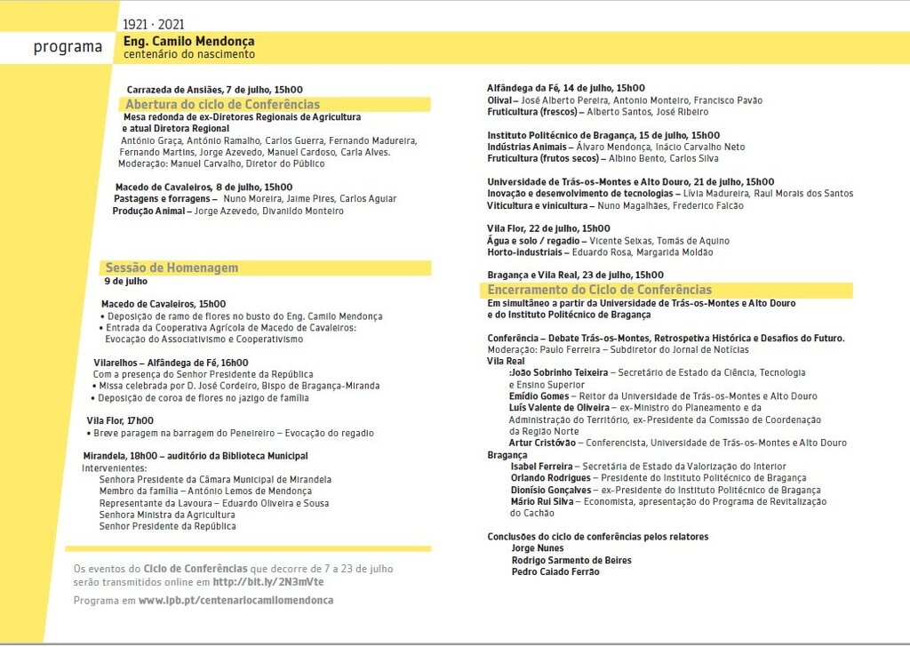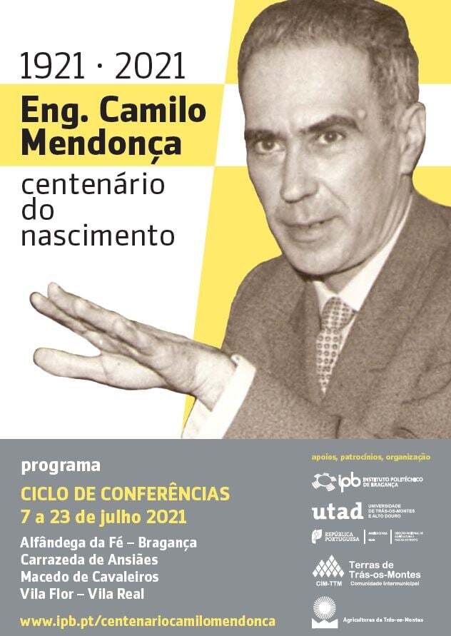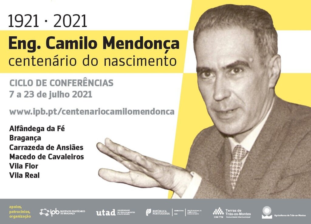 De 7 a 23 de julho irá decorrer um Ciclo de Conferências nos municípios de Alfândega da Fé, Bragança, Carrazeda de Ansiães, Macedo de Cavaleiros, Vila Flor e Vila Real, sobre o passado, presente e futuro da região, o setor agrícola, agropecuário, hídrico e os desafios das novas tecnologias e alterações climáticas. O ciclo de conferências tem transmissão online em https://bit.ly/CentenarioCamiloMendonca