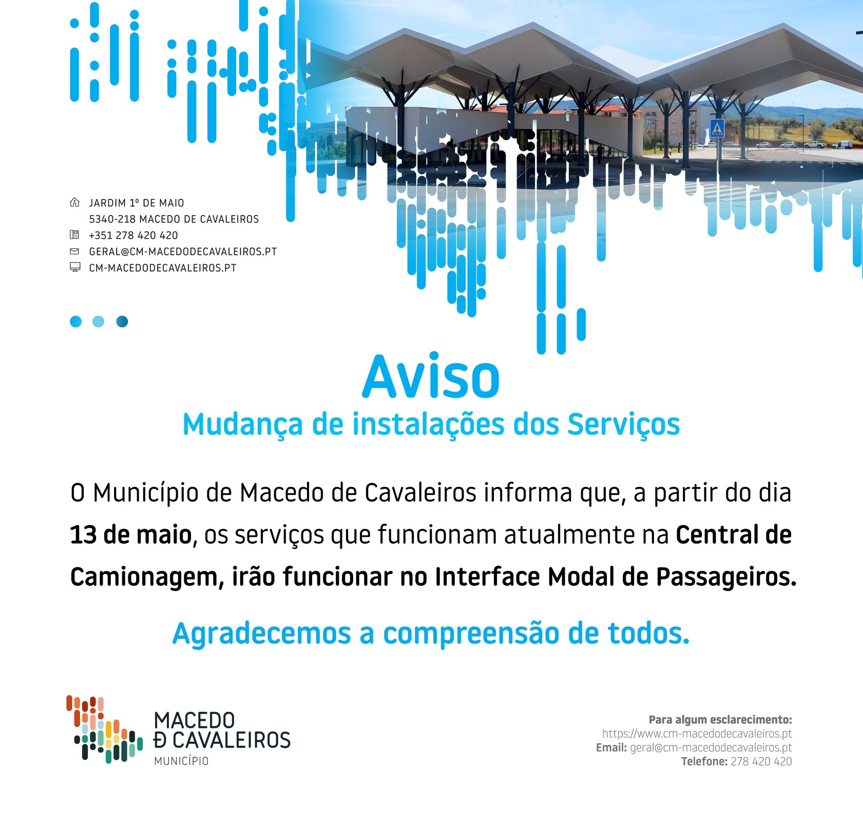 O Municipio de Macedo de Cavaleiros informa que, a partir do dia 13 de maio, os serviços quer funcionam atualmente na Central de Camionagem, irão funcionar no Interface Modal de Passageiros.