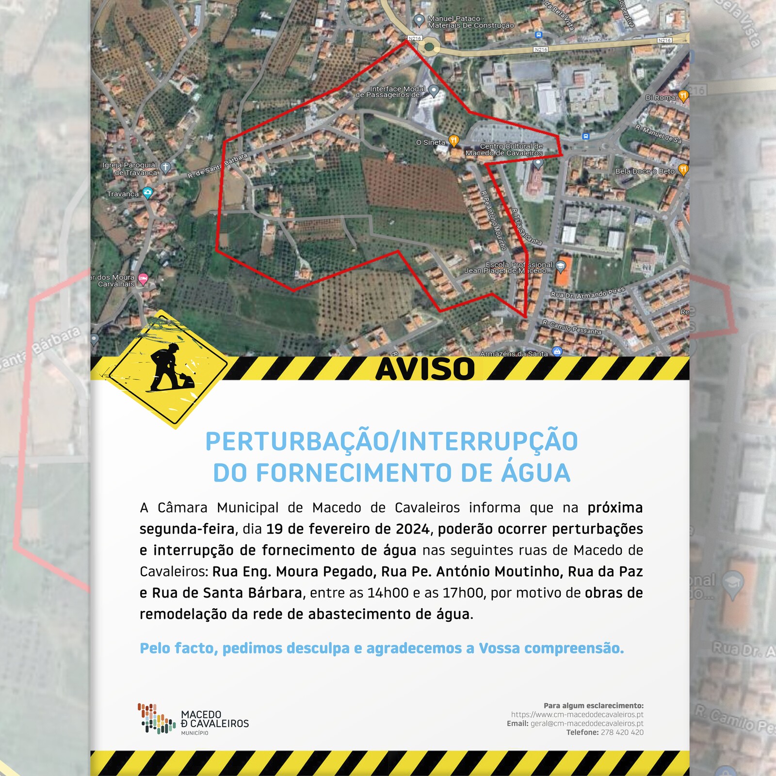 A Câmara Municipal de Macedo de Cavaleiros informa que na próxima segunda-feira, dia 19 de fevereiro de 2024, poderão ocorrer perturbações e interrupção de fornecimento de água nas seguintes ruas de Macedo de Cavaleiros: Rua Eng. Moura Pegado, Rua Padre António Moutinho, Rua da Paz e Rua de Santa Bárbara, nos períodos das 14h00 às 17h00, por motivo de obras de remodelação da rede de abastecimento de água.
