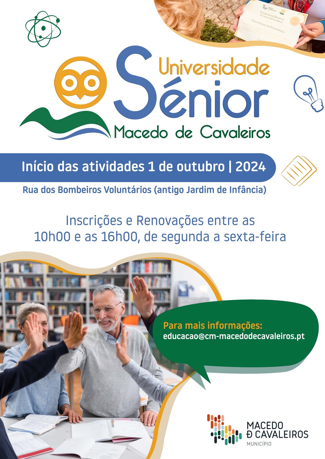 As inscrições para novos alunos e renovações para os que já a frequentam estão a decorrer na sede da Universidade, sita na Rua dos Bombeiros Voluntários, em Macedo de Cavaleiros, de segunda a sexta-feira, das 10h00 às 16h00.