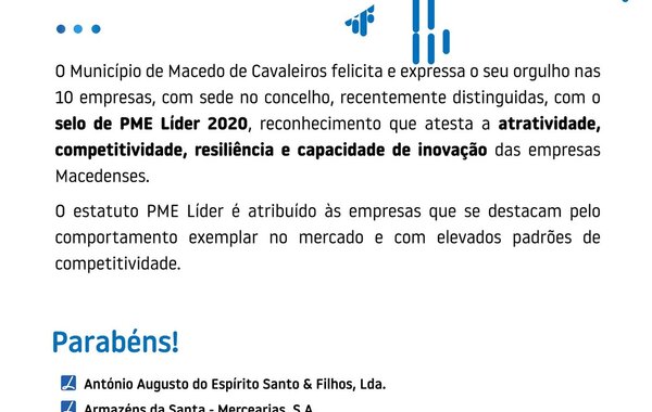O Município de Macedo de Cavaleiros felicita e expressa o seu orgulho nas 10 empresas, com sede no concelho, recentemente ... -