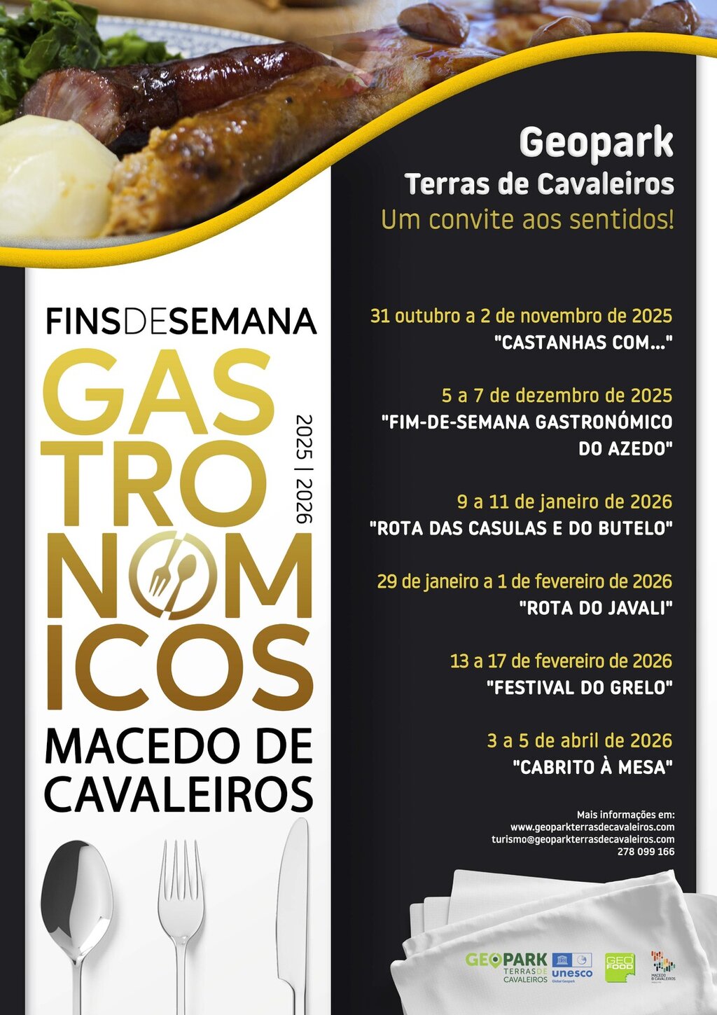 Das castanhas aos grelos, passando pelo javali e terminando com o tradicional cabrito, cada fim de semana será uma nova oportunidade para descobrir e saborear a riqueza da gastronomia local.