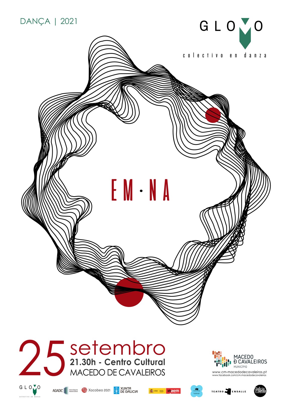 A Glovo - colectivo en danza, sediada na Galiza, apresenta no Centro Cultural de Macedo de Cavaleiros a sua mais recente criação – EM.NA. Este é um espetáculo de dança contemporânea com movimentos de beleza única e vibrantes, criado e interpretado por Esther Latorre - Lugo e pelo macedense Hugo Pereira.