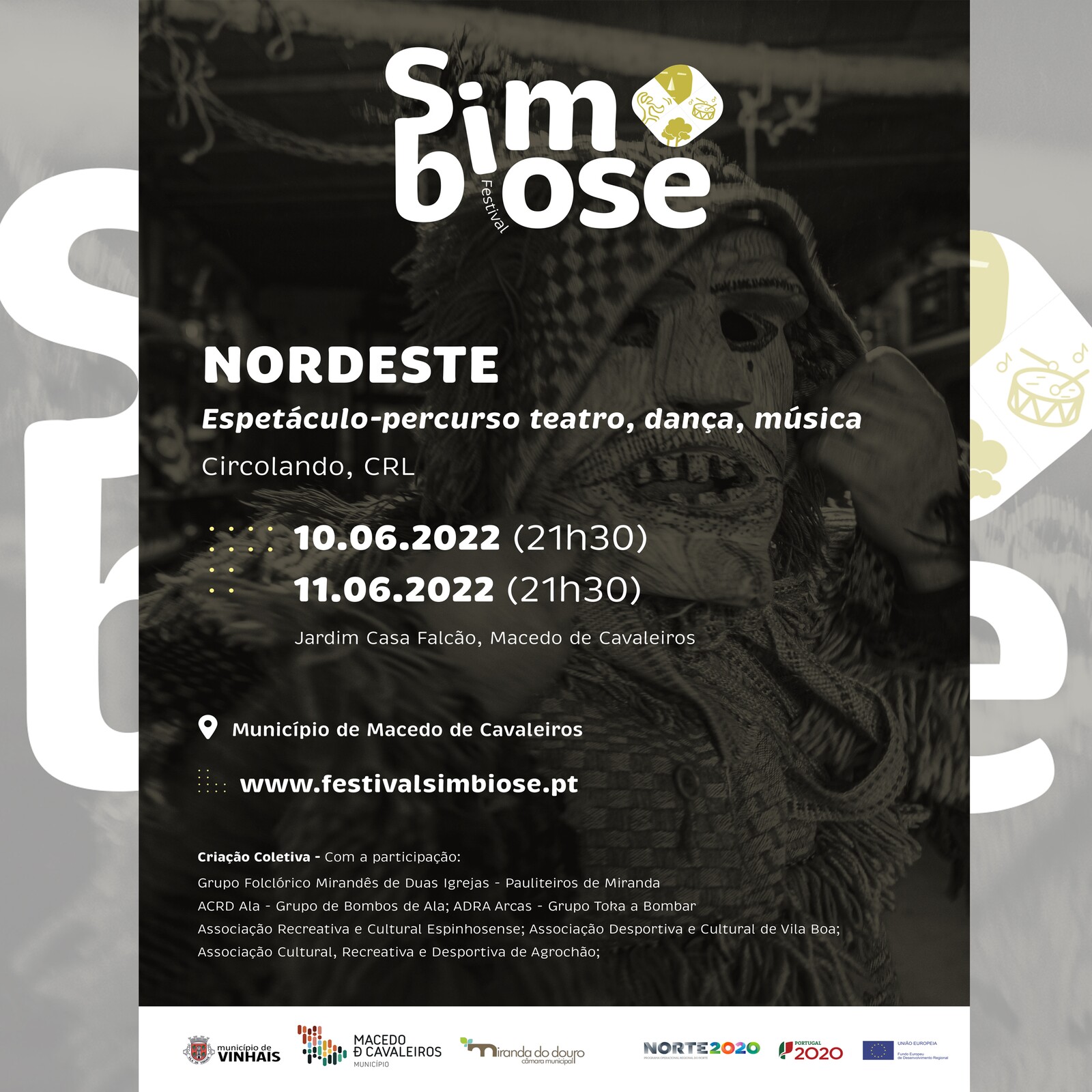 Nos dias 10 e 11 de junho, às 21h30, o Jardim da Casa Falcão vai receber o Nordeste, um projeto de criação de um espetáculo-percurso de carácter transdisciplinar (teatro, dança, vídeo, música), explorando tematicamente as máscaras e rituais das festas de inverno e o universo da Dança dos Pauliteiros.