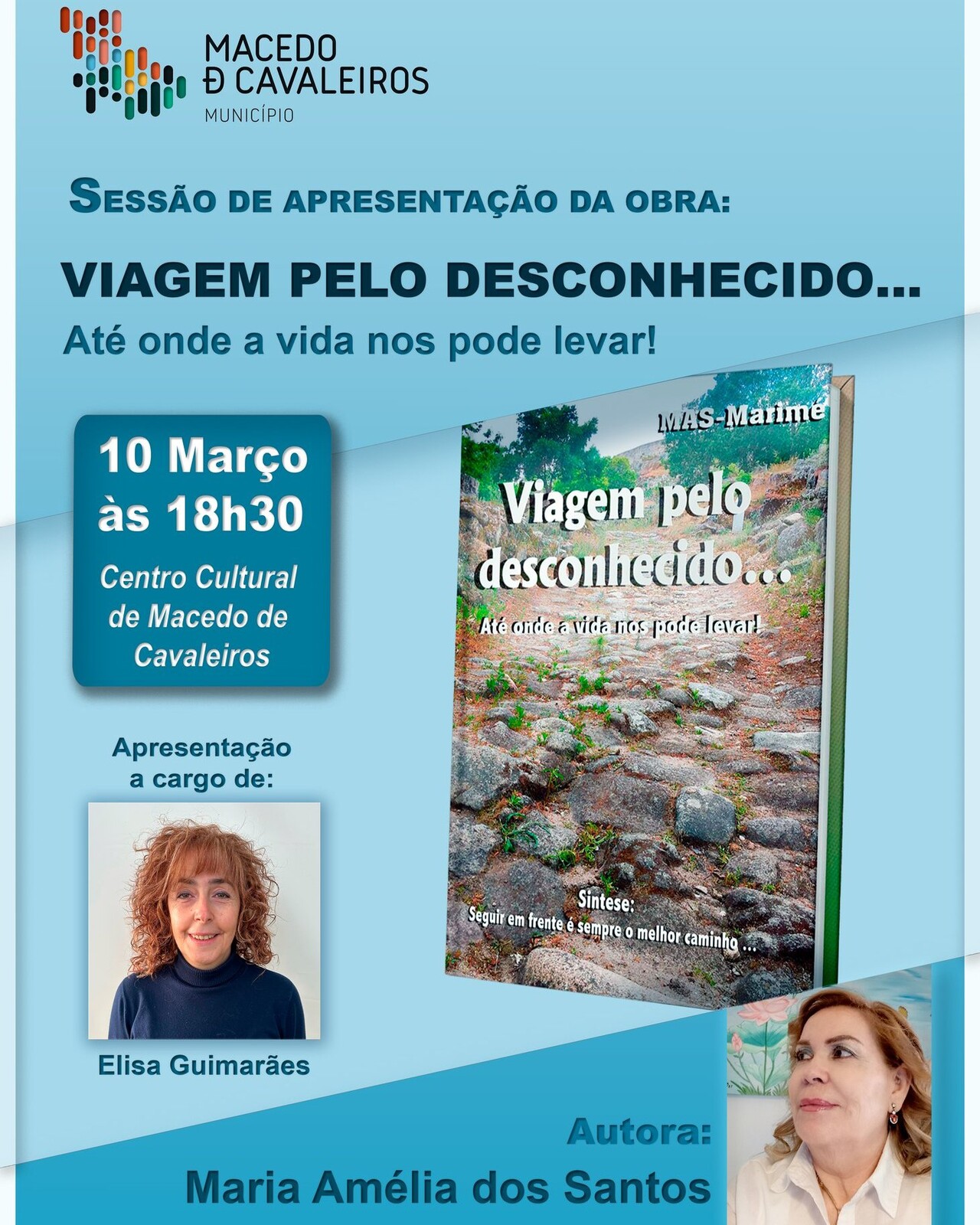 No próximo dia 10 de março, pelas 18h30, no Centro Cultural, será apresentado o livro "Viagem pelo Desconhecido... Até onde a vida nos pode levar", da autoria da Professora Maria Amélia dos Santos.