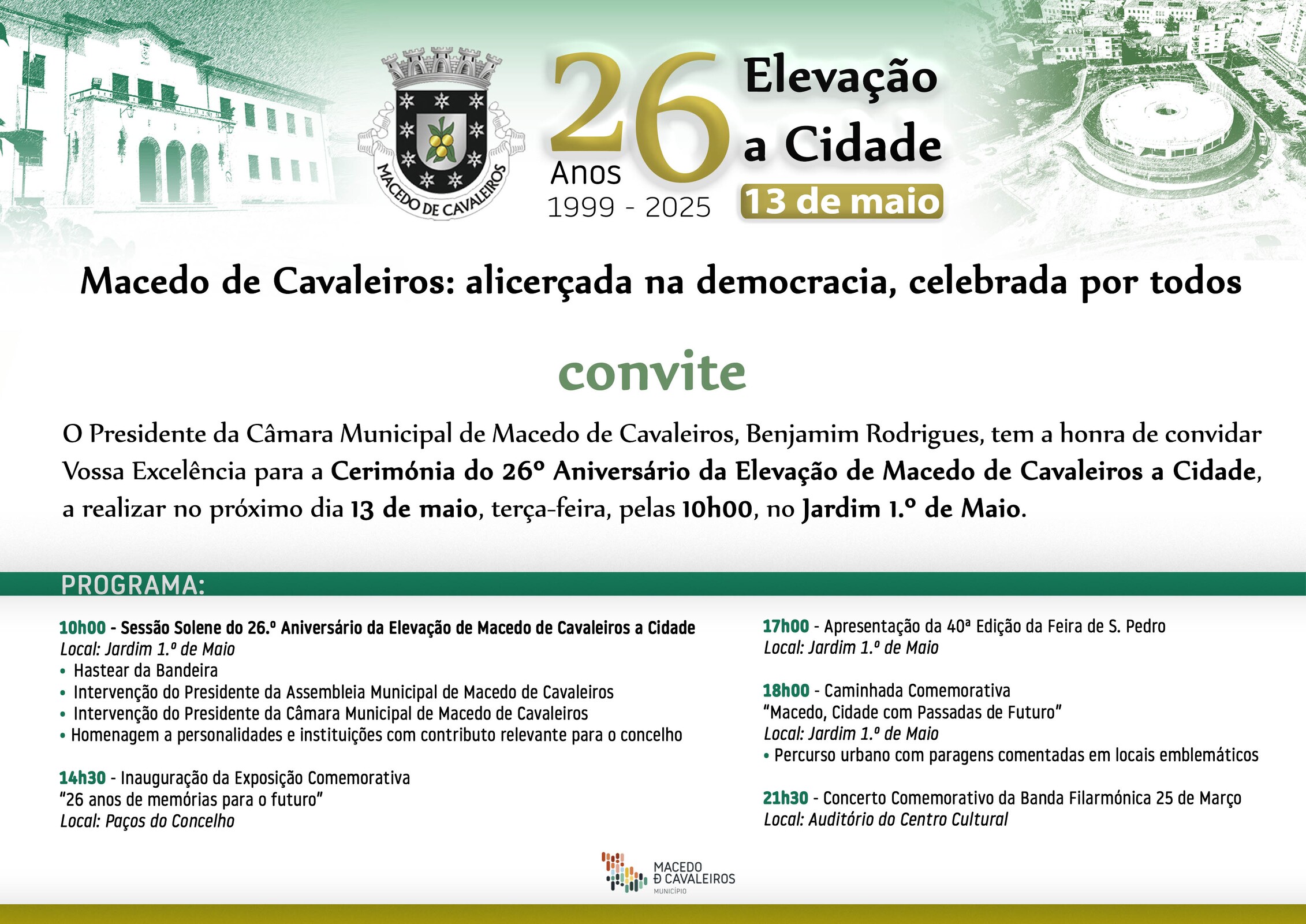 O Município de Macedo de Cavaleiros convida todos os macedenses a participarem nas cerimónias comemorativas do 26.º aniversário da elevação de Macedo de Cavaleiros a cidade, no dia 13 de maio, com início às 10h00 no Jardim 1.° de Maio.