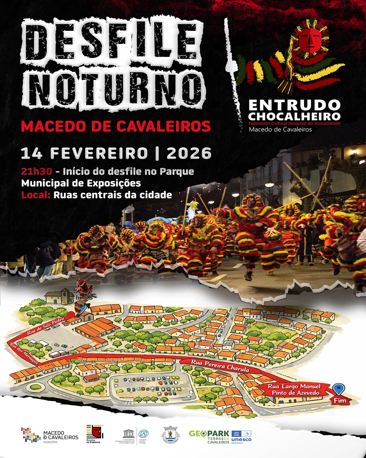 No dia 14 de fevereiro, às 21h30, o amor, a tradição e a alegria encontram-se nas ruas de Macedo de Cavaleiros com o Desfile Noturno do Entrudo Chocalheiro.