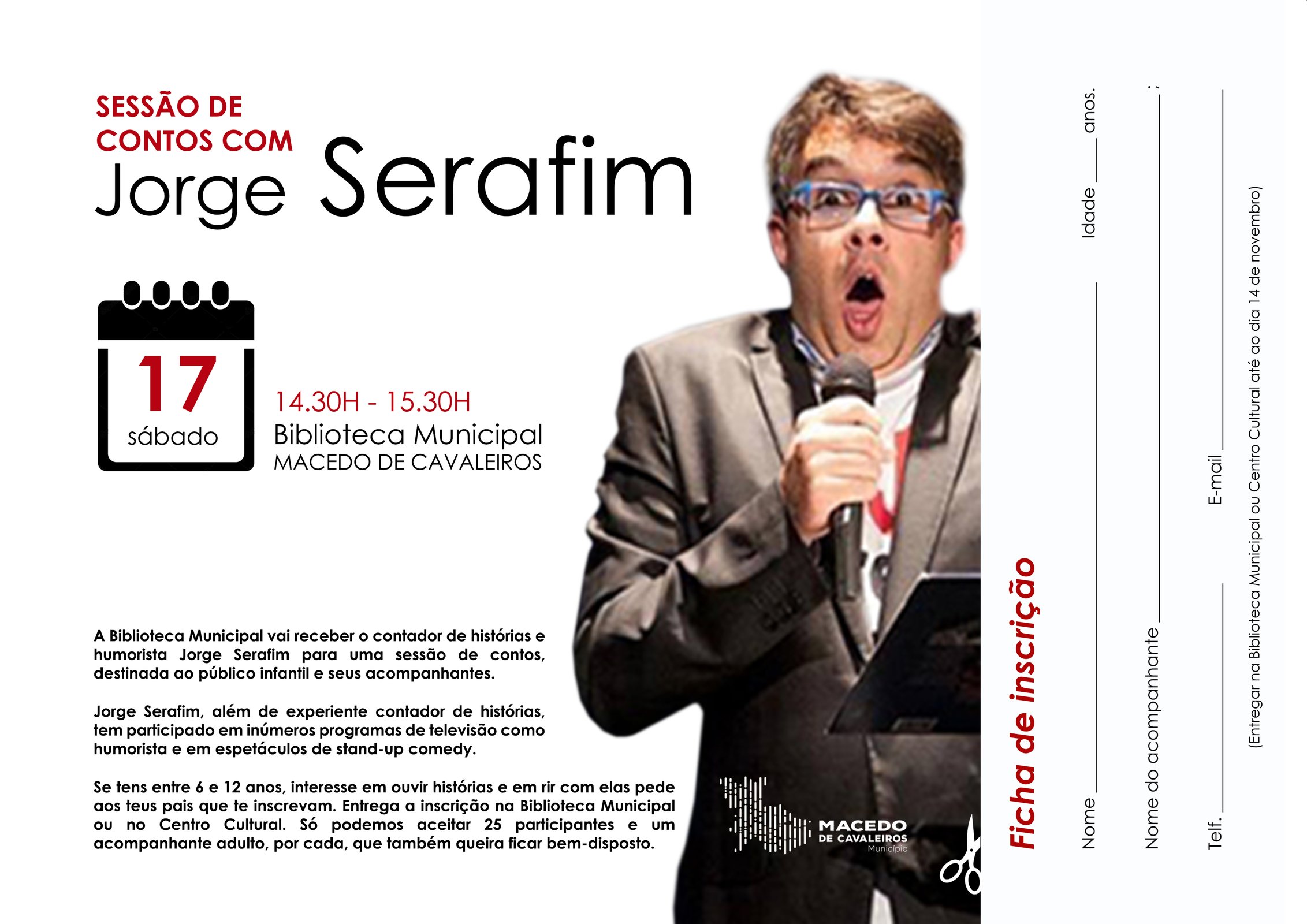 A Biblioteca Municipal de Macedo de Cavaleiros promove os livros e a leitura com a presença do humorista Jorge Serafim. O evento, com entrada livre, que se destina ao público mais jovem, acontece no dia 17 de novembro, com início agendado para as 14:30 h.