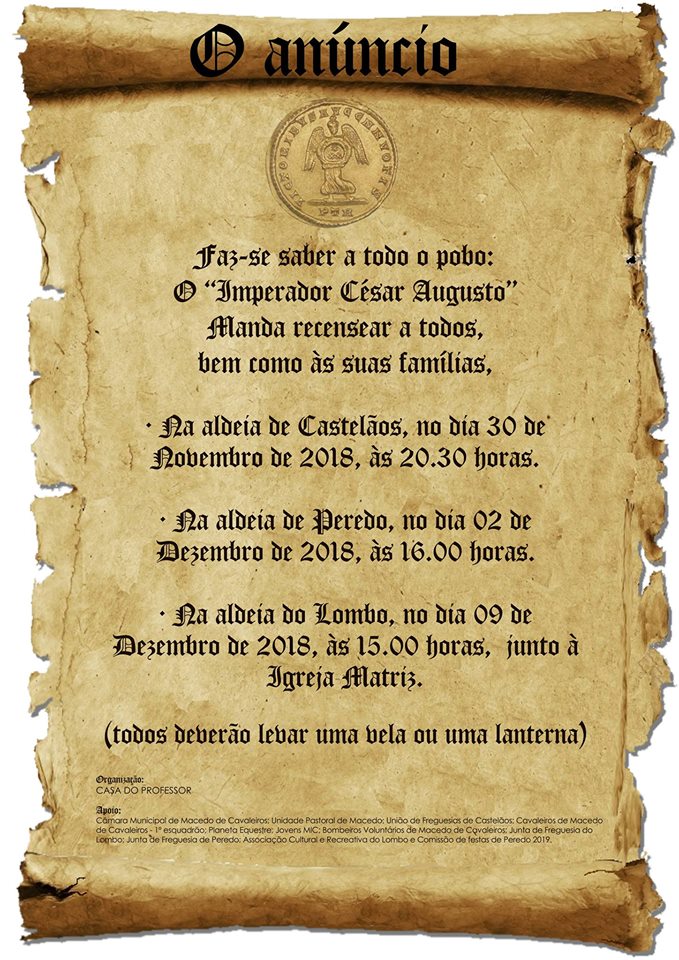 A Casa do Professor leva o Anúncio a três aldeias do concelho: no dia 30 de novembro a Castelãos, pelas 20:30h, a Peredo, no dia 2 de dezembro, pelas 16:00h e termina no Lombo, no dia 9 de dezembro às 15:00h.