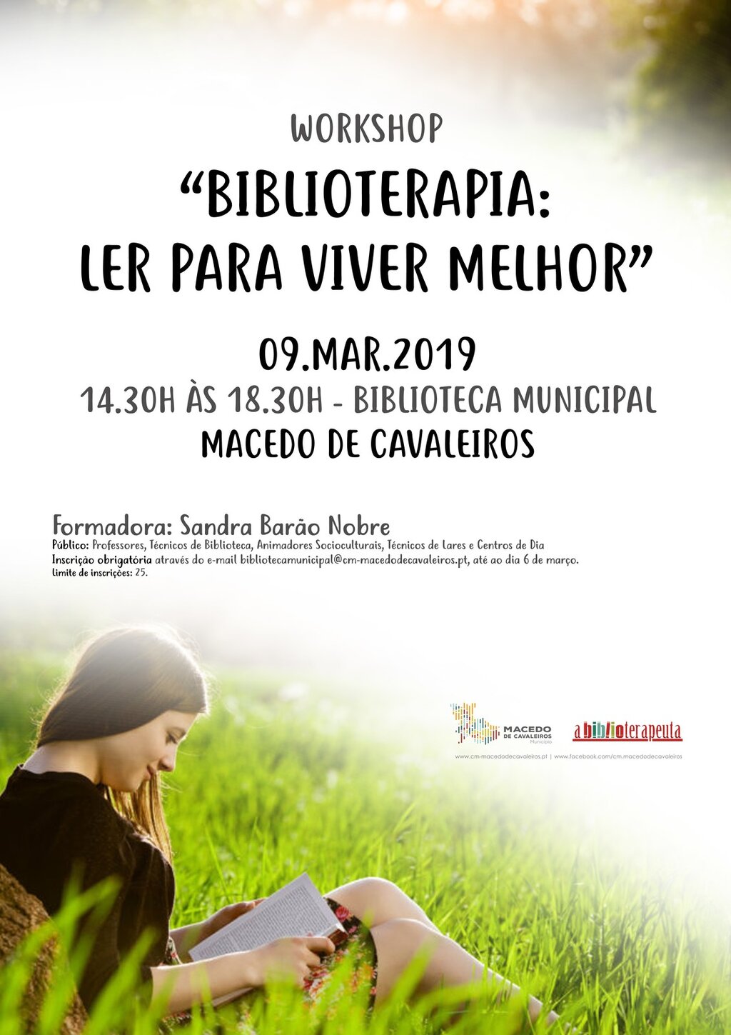 A biblioterapia, parece paradoxal, ganha importância no momento em que a Internet e os ecrãs ocupam cada vez mais o nosso tempo e espaço de lazer. Que livro ler para ultrapassar certo problema ou desafio? Esta é a resposta que poderá encontrar com a biblioterapeuta Sandra Barão Nobre no workshop que aqui propomos. Inscrição obrigatória através do e-mail bibliotecamunicipal@cmmacedodecavaleiros.pt até ao dia 6 de março, limitada às primeiras 25 inscrições.