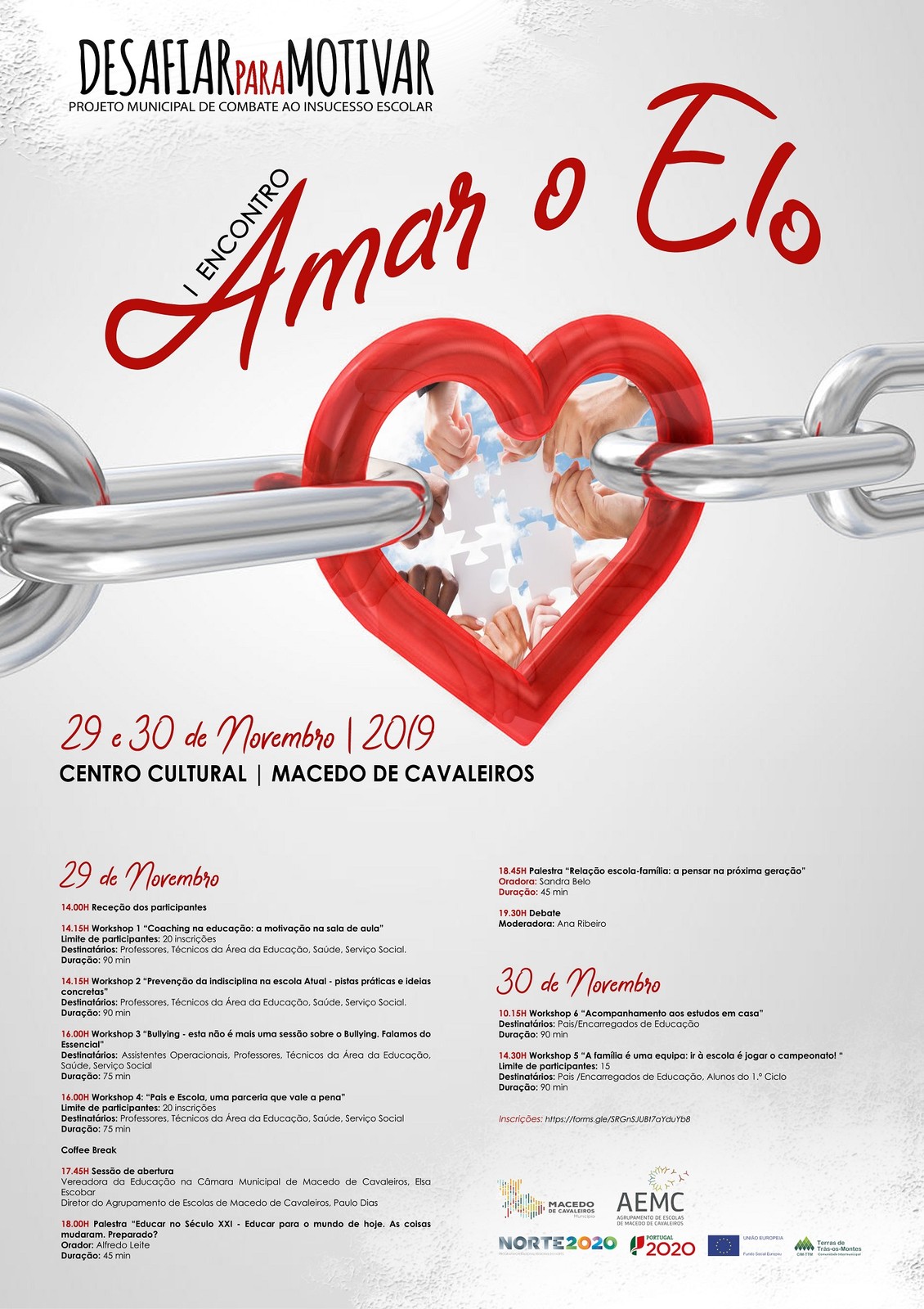 Tendo traçado como meta aumentar o sucesso dos alunos de Macedo de Cavaleiros, o Município vai realizar, no âmbito do Projeto “Desafiar para Motivar” – Programa Integrado Inovador de Combate ao Insucesso Escolar (PIICIE) o 1º Encontro de Educação em Macedo de Cavaleiros – Amar o Elo, no Centro Cultural de Macedo de Cavaleiros.