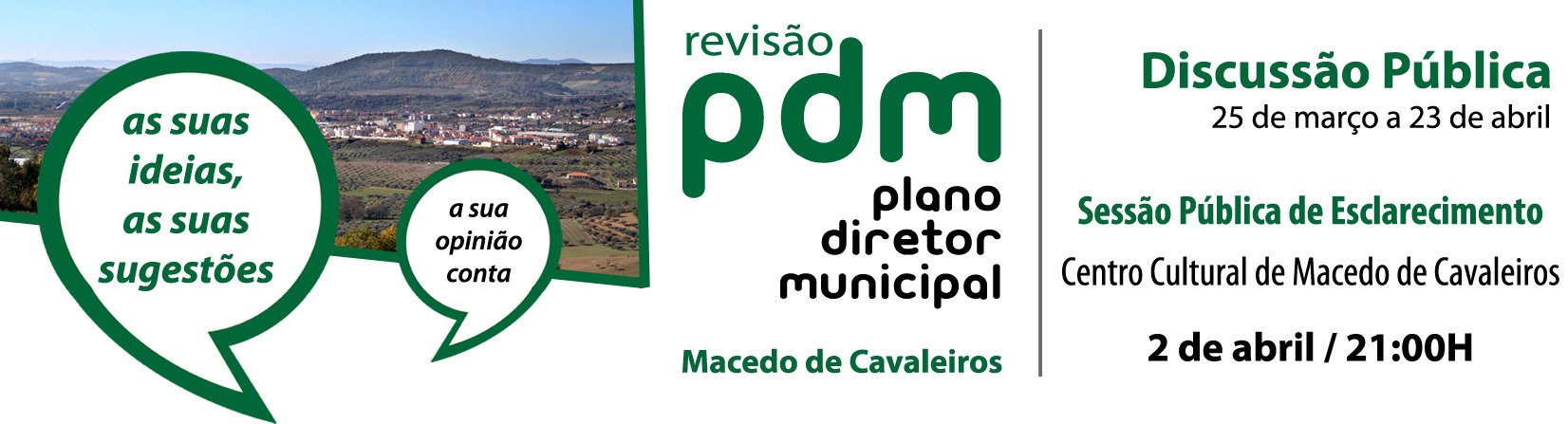 A Câmara Municipal realiza, na próxima quinta-feira, dia 2 de abril, às 21:00H, no Centro Cultural, uma sessão de esclarecimento, aberta a toda a comunidade, da Proposta de Revisão do Plano Diretor Municipal de Macedo de Cavaleiros. Na sessão, será apresentado o novo plano estruturante de desenvolvimento, os seus objetivos, estratégia e propostas.