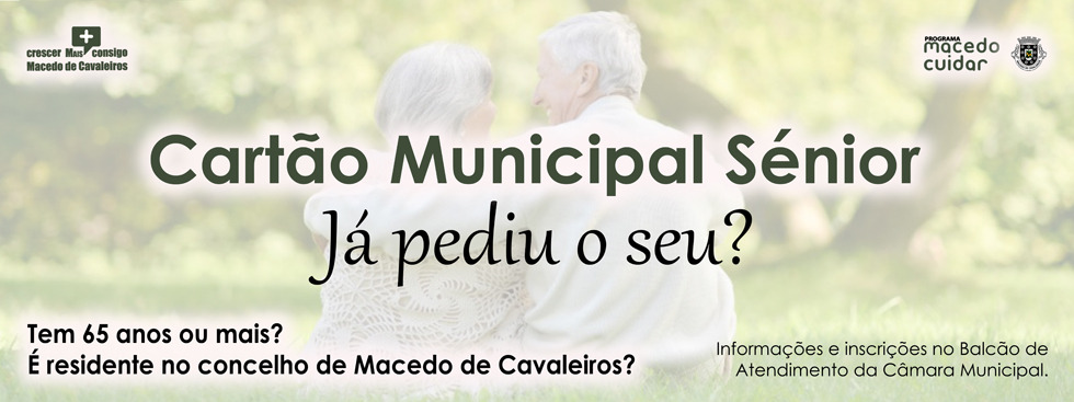 A Câmara Municipal de Macedo de Cavaleiros lança o Cartão Municipal Sénior, dirigido aos cidadãos com 65 anos ou mais, residentes no concelho. A partir desta segunda-feira as inscrições entram em vigor. A adesão a esta iniciativa de apoio é feita através do preenchimento de requerimento-tipo no Balcão de Atendimento da Câmara Municipal, ao longo de todo o ano.