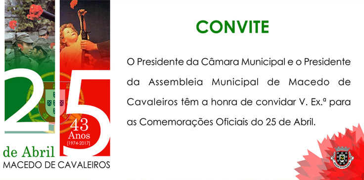 Macedo de Cavaleiros vai assinalar os 43 anos da revolução democrática na manhã de terça-feira. Na cerimónia oficial, com discursos do Presidente da Câmara Municipal e Assembleia Municipal, serão também assinados os Acordos de Execução com as 30 Juntas de Freguesia do concelho, num montante global de 200 Mil Euros. Em seguida, será feito um roteiro pelas localidades que foram sede de concelho e que hoje integram o de Macedo de Cavaleiros.