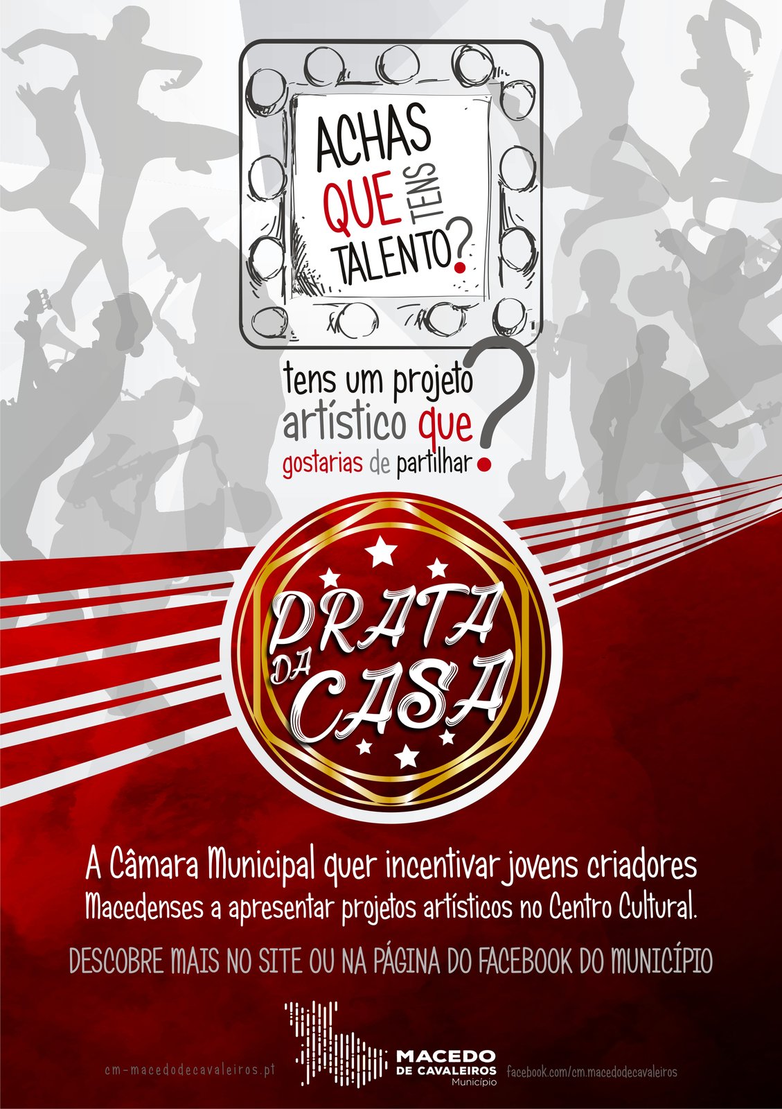 O projeto “Prata da Casa”, promovido pela Câmara Municipal de Macedo de Cavaleiros, propõe-se incentivar jovens criadores Macedenses na apresentação de projetos artísticos no Centro Cultural, dando apoio na produção dos projetos selecionados, através de acompanhamento técnico e logístico. Os projetos artísticos a apoiar poderão ser desenvolvidos nas seguintes áreas: música (em todos os seus géneros), performance, teatro, vídeo e cinema.