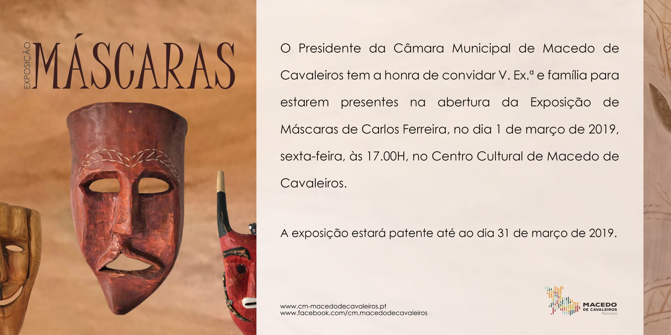 O Município de Macedo de Cavaleiros inaugura na próxima sexta-feira, dia 01 de março de 2019, a Exposição de Máscaras de Carlos Ferreira. A máscara é um adereço utilizado em diferentes situações, como disfarce, objeto lúdico, religioso ou artístico. Tanto pode revelar como esconder uma identidade ou, ainda, transformar a identidade e a vida de quem a usa.