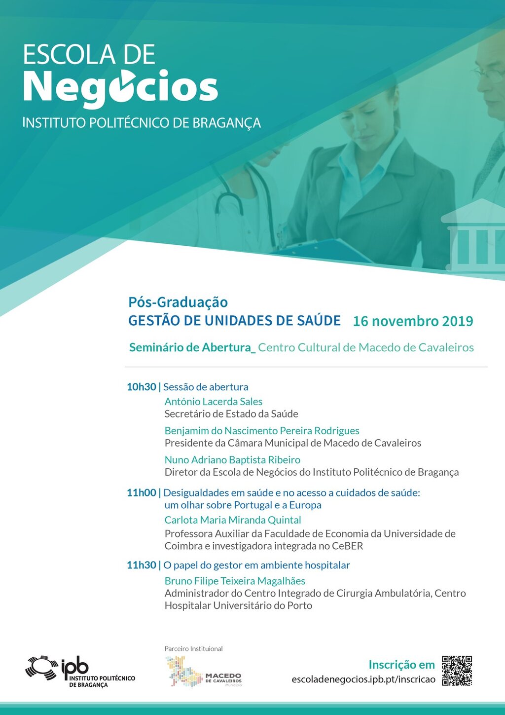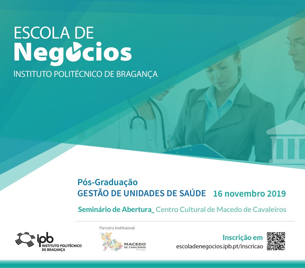 A Câmara Municipal de Macedo de Cavaleiros e o Instituto Politécnico de Bragança promovem amanhã, dia 16 de novembro de 2019, a partir das 10h30, um Seminário de Abertura da Pós-Graduação em Gestão de Unidades de Saúde, que irá ser lecionada na Escola de Negócios instalada no concelho macedense. A sessão conta com a presença do secretário de Estado da Saúde, António Lacerda Sales.