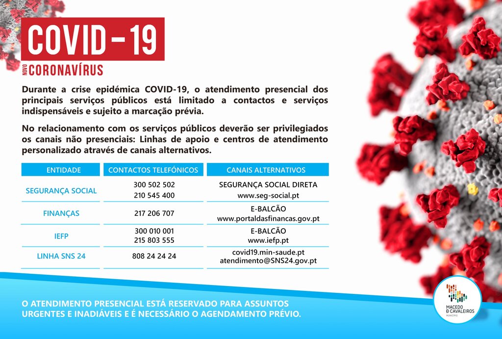 Durante a crise epidémica COVID-19, o atendimento presencial dos principais serviços públicos está limitado a contactos e serviços indispensáveis e sujeito a marcação prévia.