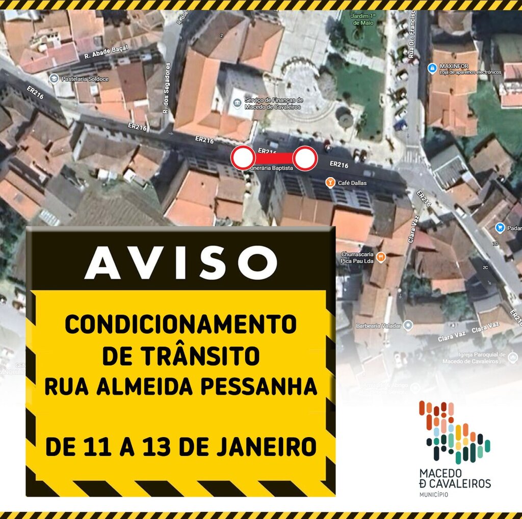 A Câmara Municipal informa que, devido à desmontagem dos espaços do Bô Natal Macedo, o trânsito estará condicionado na Rua Almeida Pessanha entre os dias 11 e 13 janeiro, exceto para moradores e para operações de carga e descarga.