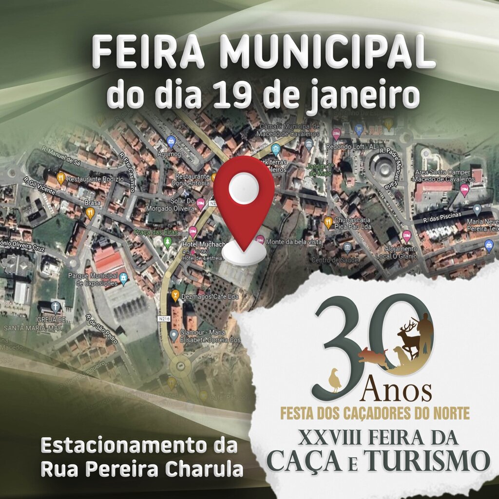 A Câmara Municipal informa que a Feira Municipal do dia 19 de janeiro se realizará no Estacionamento da Rua Pereira Charula (junto ao Parque Urbano Eng.º Luís Vaz) dado que o Parque Municipal de Exposições se encontra indisponível, devido à realização da XXVIII Feira da Caça e Turismo e da XXX Festa dos Caçadores do Norte.