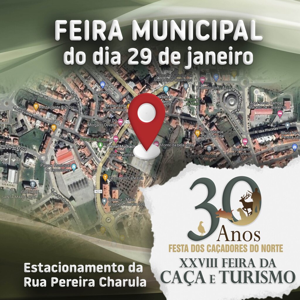 A Câmara Municipal informa que a Feira Municipal do dia 29 de janeiro se realizará no Estacionamento da Rua Pereira Charula (junto ao Parque Urbano Eng.º Luís Vaz) dado que o Parque Municipal de Exposições se encontra indisponível, devido à realização da XXVIII Feira da Caça e Turismo e da XXX Festa dos Caçadores do Norte.