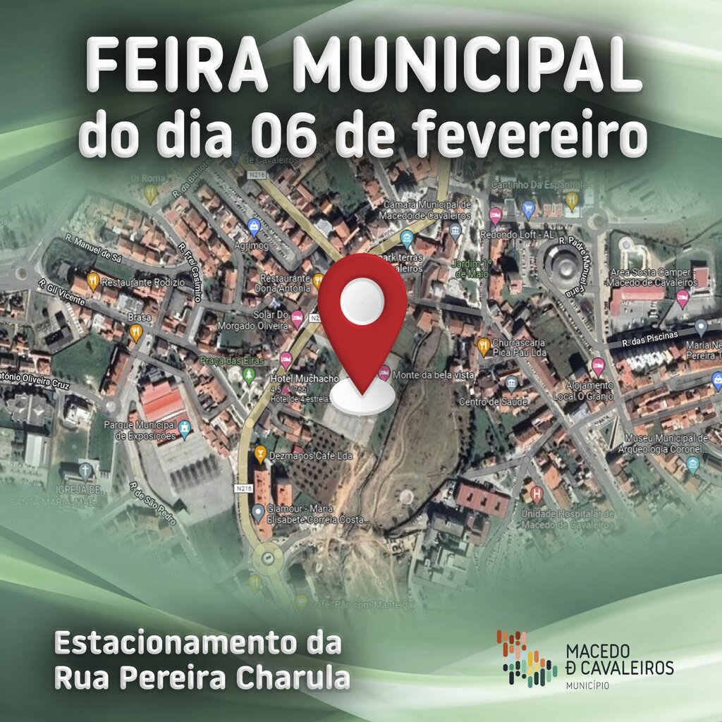 A Câmara Municipal informa que a Feira Municipal do dia 6 de fevereiro se realizará no Estacionamento da Rua Pereira Charula (junto ao Parque Urbano Eng.º Luís Vaz) dado que o Parque Municipal de Exposições se encontra indisponível.