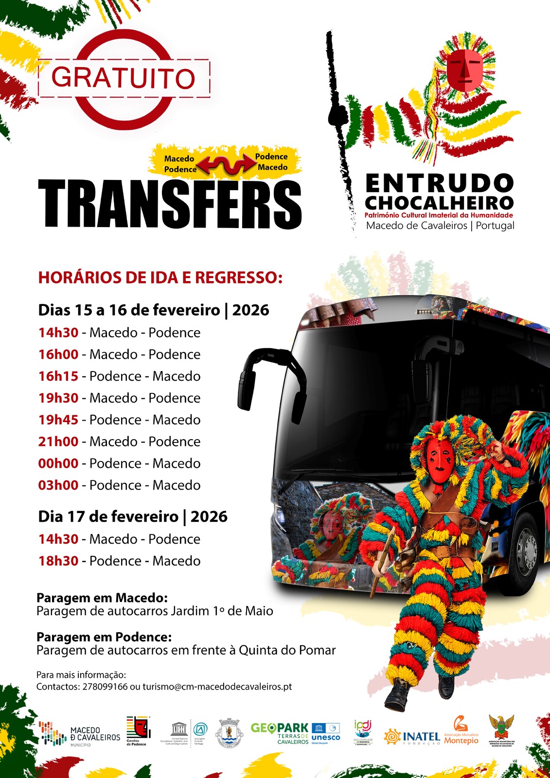 O Município de Macedo de Cavaleiros vai assegurar transporte gratuito entre Macedo de Cavaleiros e Podence durante o Entrudo Chocalheiro, nos dias 15, 16 e 17 de fevereiro.