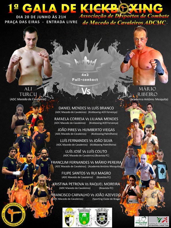 Estão agendados 10 combates de Full-Contact para a 1ª Gala do Kickboxing de Macedo de Cavaleiros, que se realizará na Praça das Eiras, no próximo sábado, dia 20, às 21:00H. Os combates, reconhecidos pela Federação Portuguesa de Kickboxing e Muay Thai, vão opor os atletas, de diferentes escalões, da Associação de Desportos de Combate de Macedo de Cavaleiros (ADCMC), a atletas de 5 outros clubes: Academia António Mesquita, Kickboxing ACR Fervença, Kickboxing Palmilheira, Boavista FC e Sporting Clube de Braga.