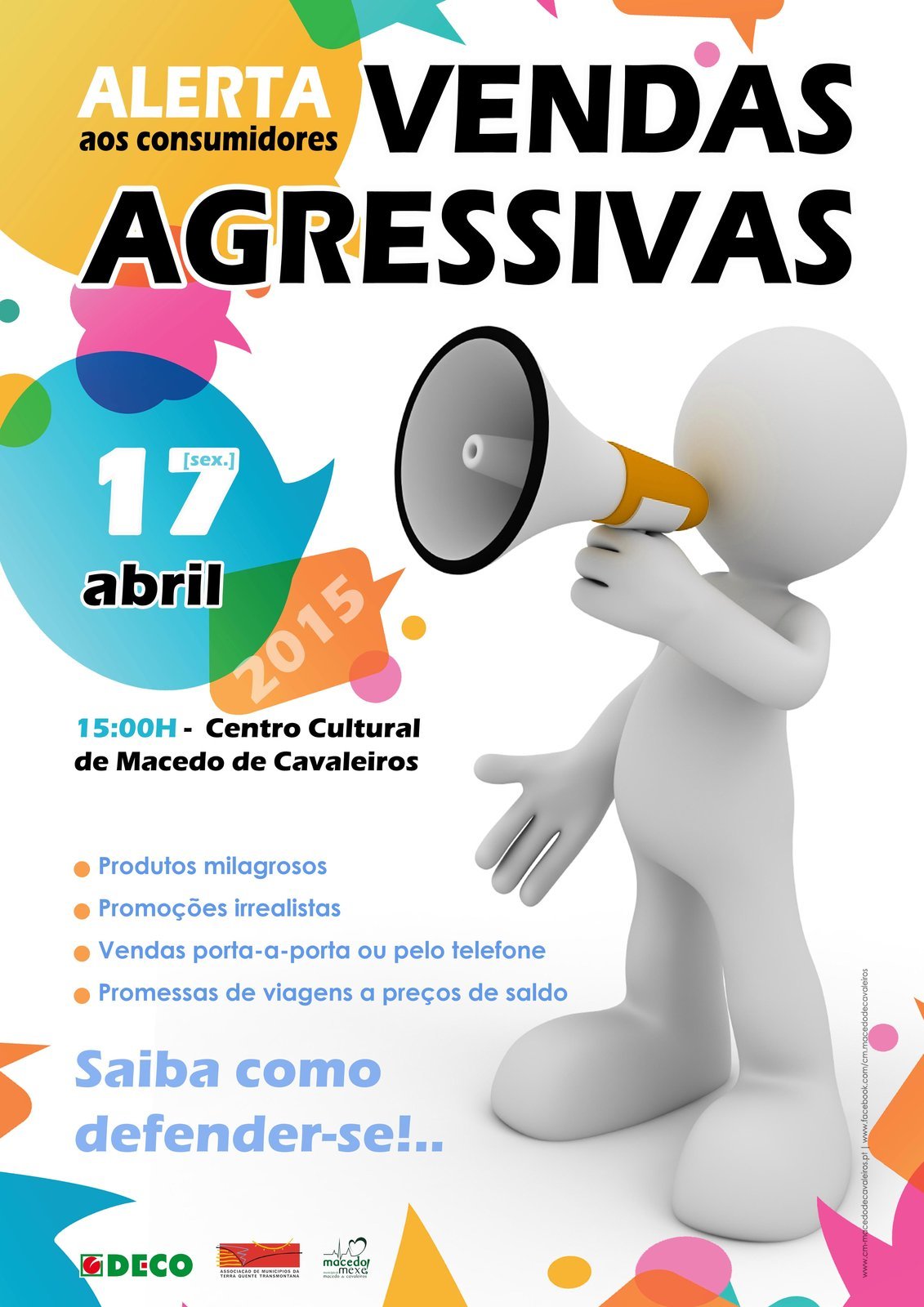 O objetivo é alertar os consumidores para o perigo das vendas agressivas. A Associação de Defesa do Consumidor (DECO) e a Câmara Municipal de Macedo de Cavaleiros, no âmbito do protocolo de colaboração com a Associação de Municípios da Terra Quente Transmontana, realizam uma sessão informativa sobre Vendas Agressivas, na próxima sexta-feira, dia 17, às 15:00H, no Centro Cultural.