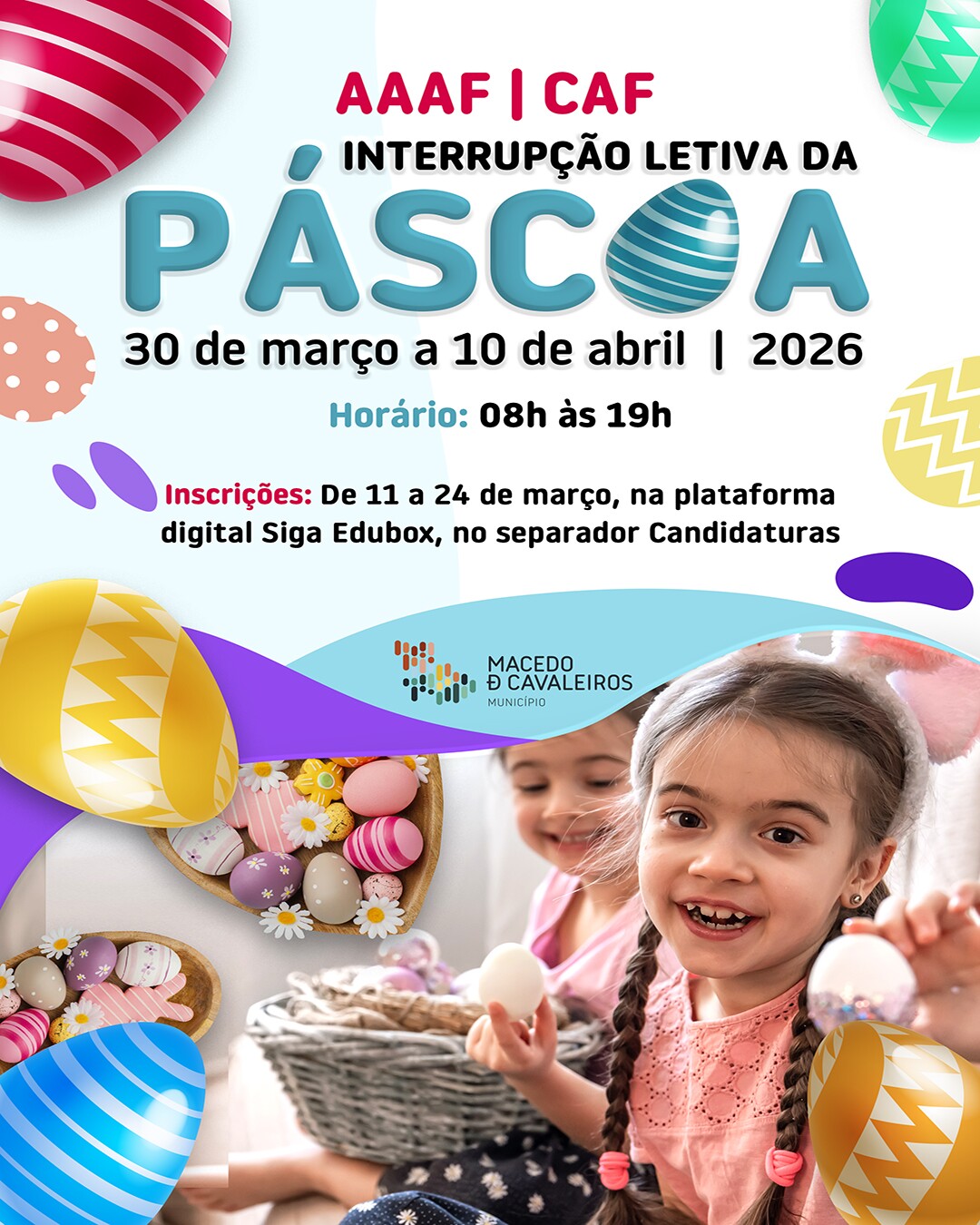 As inscrições para a frequência das Atividades de Animação e de Apoio à Família (AAAF) – Educação Pré-escolar e da Componente de Apoio à Família (CAF) – 1º Ciclo do Ensino Básico, durante a interrupção letiva da Páscoa, vão decorrer de 11 a 24 de março.
